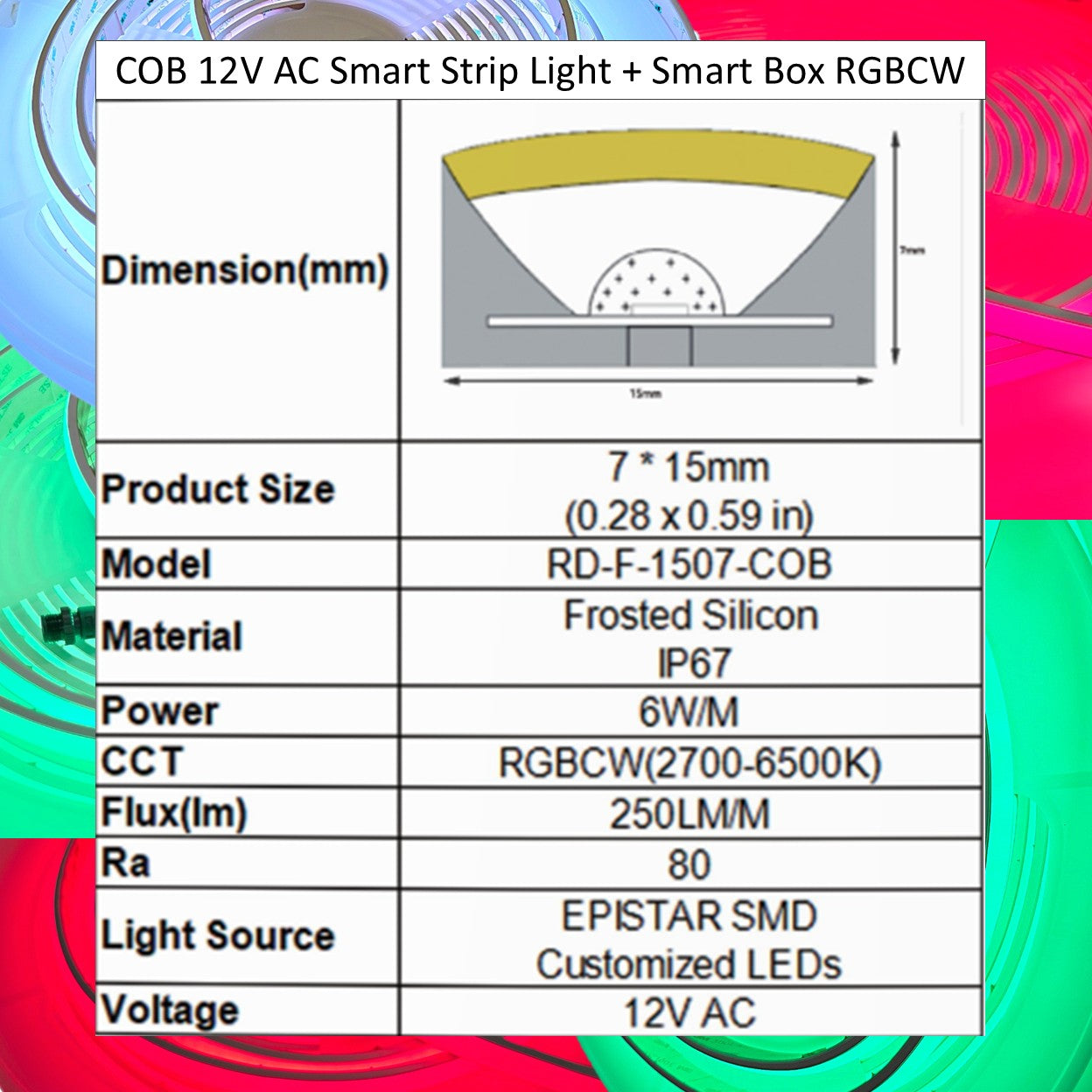 • Size: 15x7mm, frosted solid silicone, extrusion IP67, 6W/M, 250lm/M, 12VAC, Ra>80