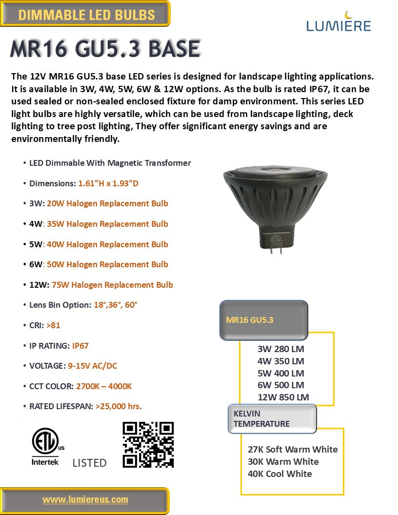 • Choose from 8 Pack 3W, 4W, 5W, 6W or 12W LED MR16 2700K - 3000K BULBS - Dimmable