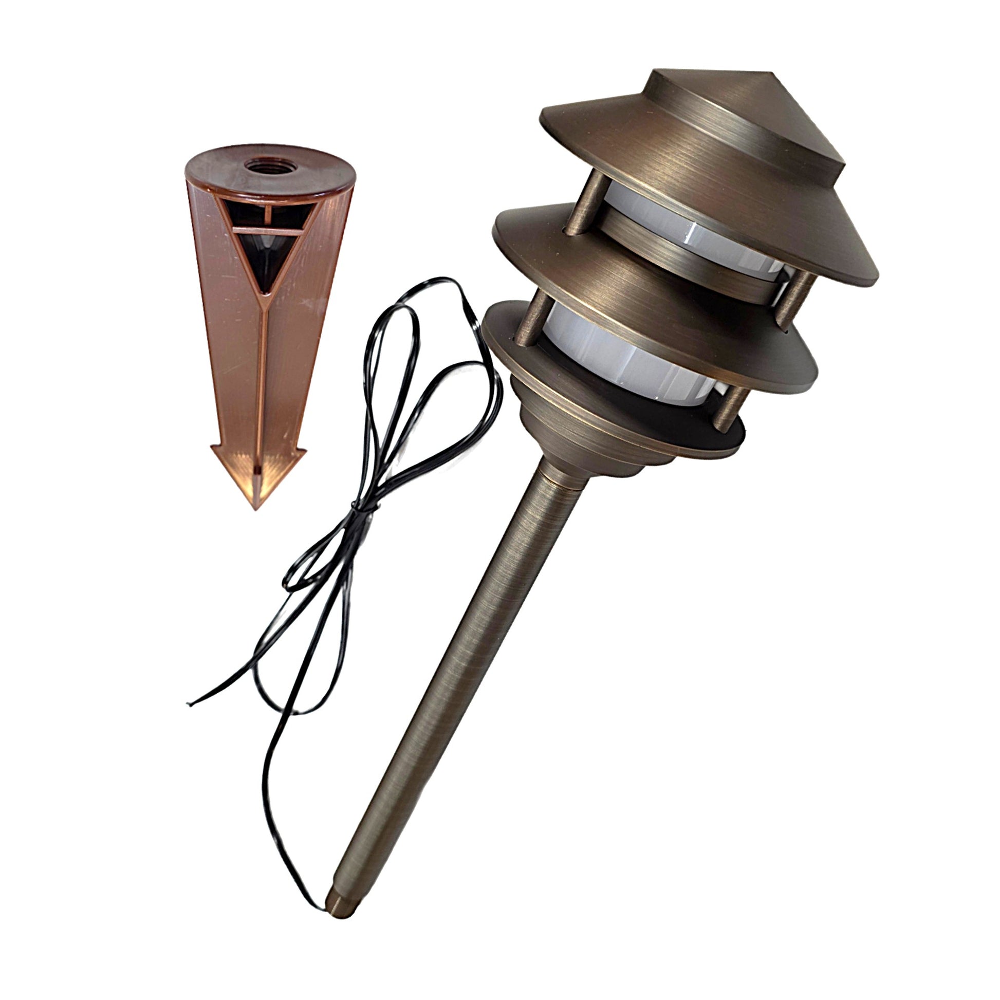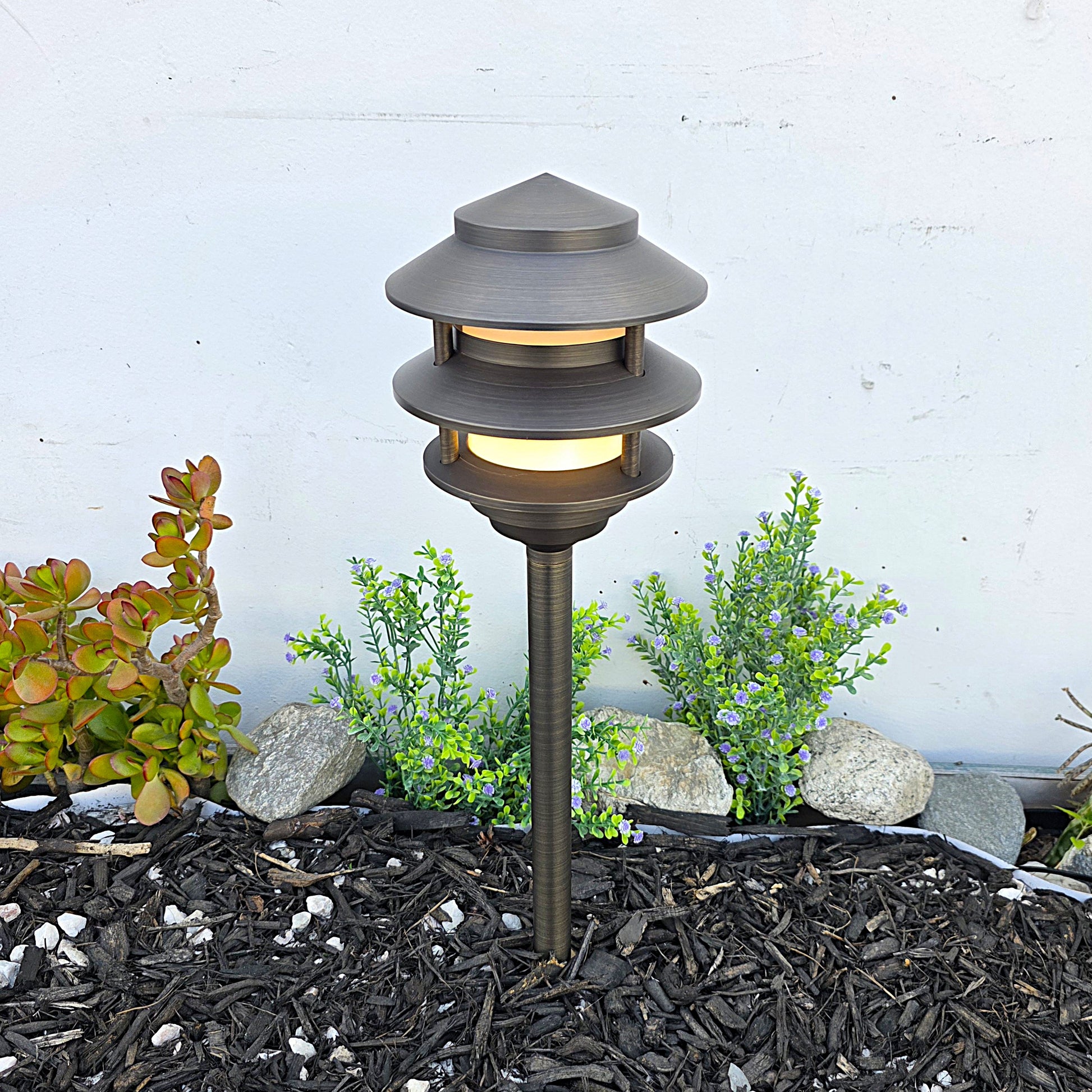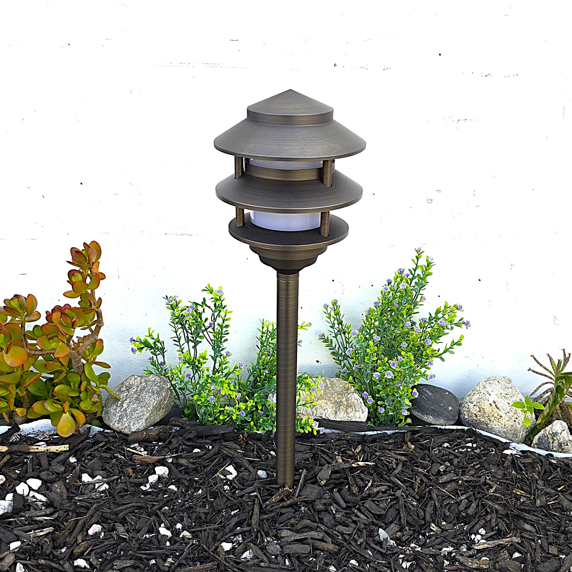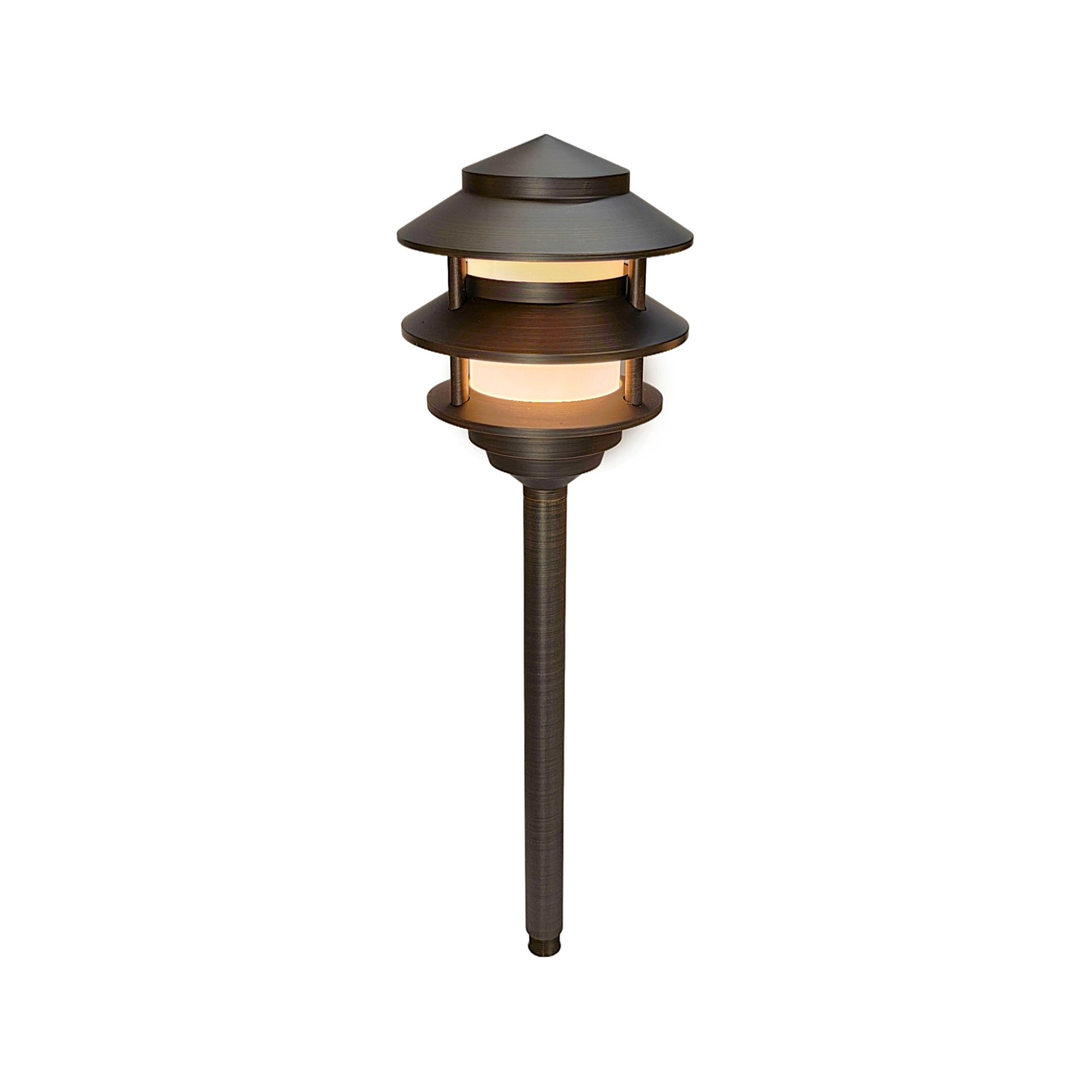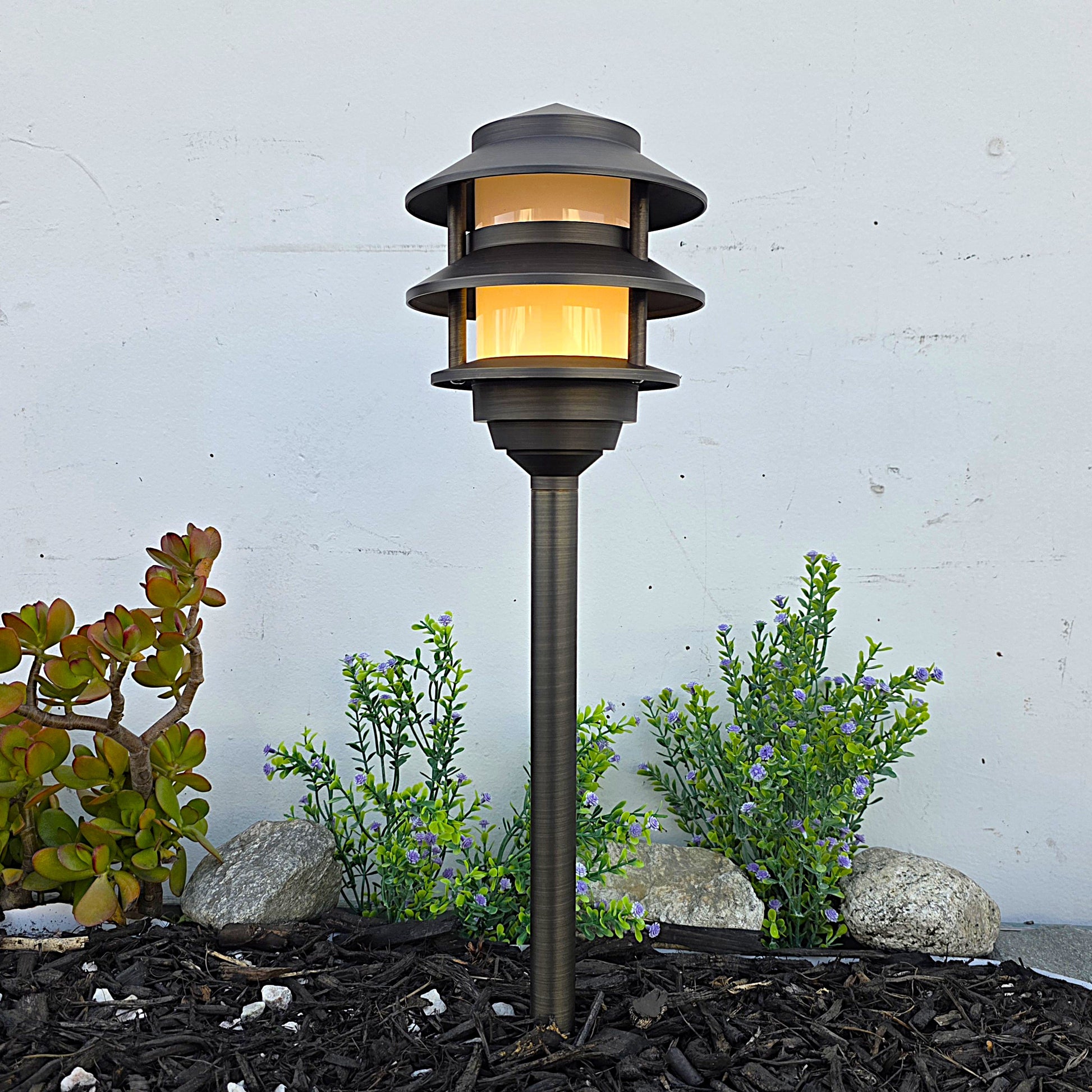 Crafted from solid, premium brass and equipped with energy-saving LED technology, the Bougie pagoda pathway light offers a robust and adaptable solution for illuminating walkways. Available in a classic antique bronze or sleek black finish, its distinctive design and corrosion-resistant brass construction make it suitable for harsh outdoor conditions. Consuming 90% less energy than traditional incandescent bulbs, this fixture provides an elegant, sustainable lighting option that combines longevity with efficiency.