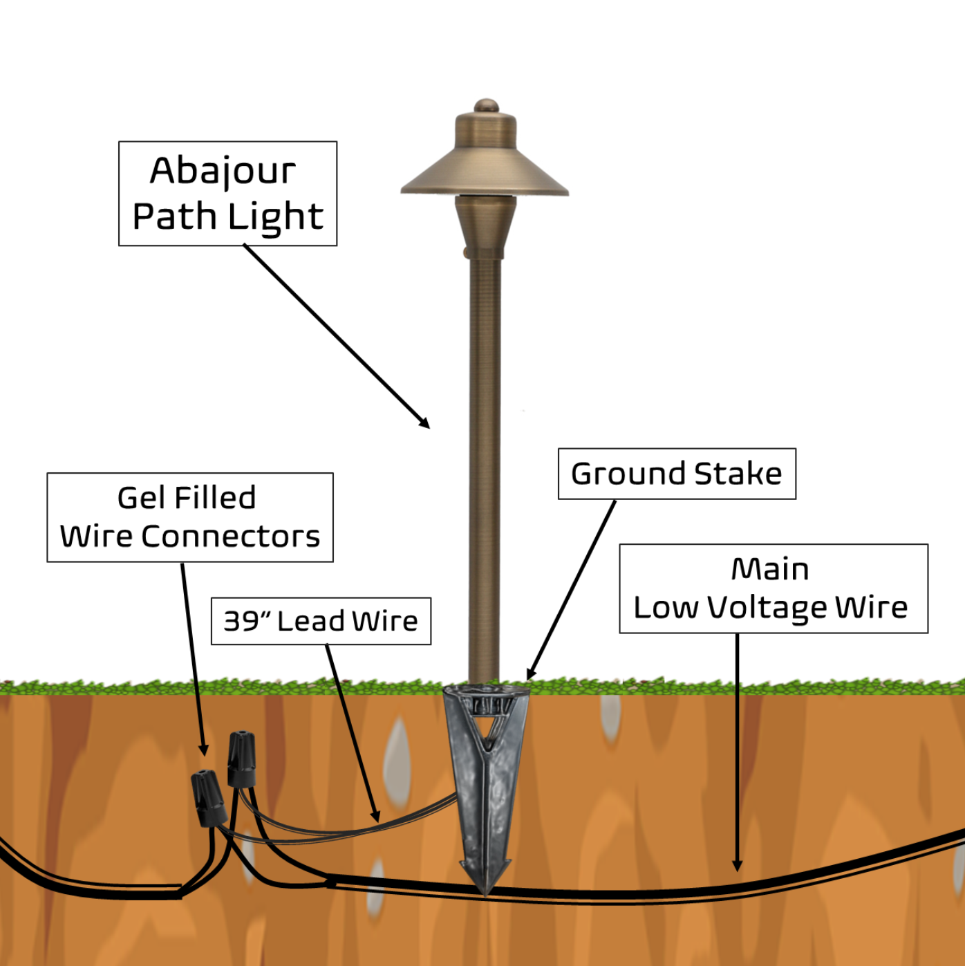 To achieve the best performance from your low voltage outdoor lights, be sure to install them with a 12V Low Voltage Transformer. Use grease-filled, waterproof wire nut connectors to secure all connections between fixtures, ensuring safety and long-lasting durability.