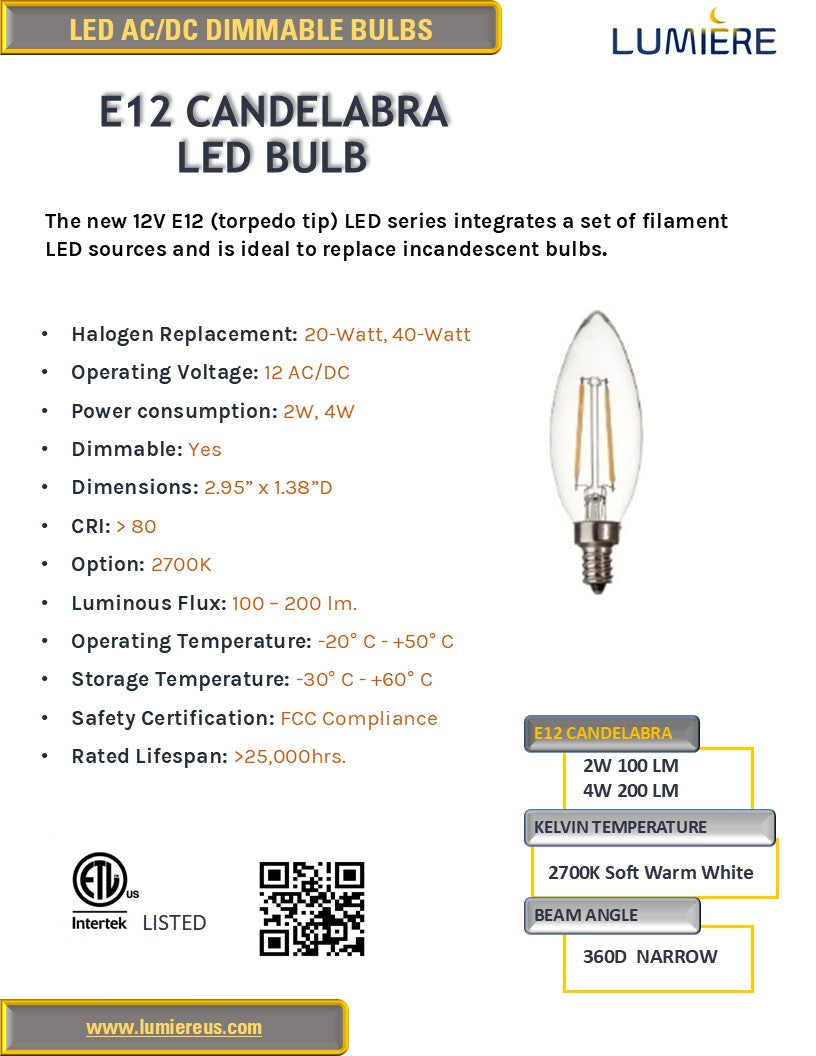 The new 12V E12 (torpedo tip) LED series integrates a set of filament LED sources and is ideal to replace incandescent bulbs. This series LED light bulbs are highly versatile, which can be in outdoor enclosed fixtures and offer significant energy savings and are environmentally friendly. Light output is 360° which is perfect for even dispersion applications.
