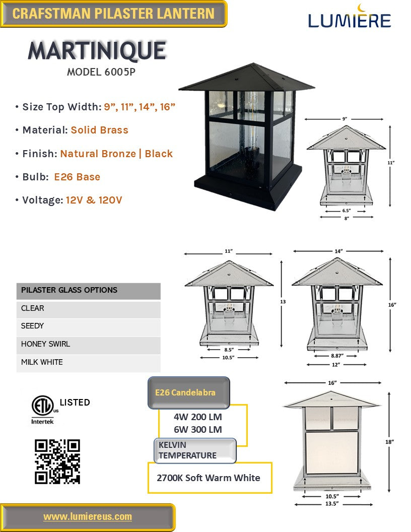 The Martinique Solid Brass Craftsman Pilaster Lantern Light is a meticulously handcrafted masterpiece, proudly made in the USA. Please allow 7-14 days for its careful production.